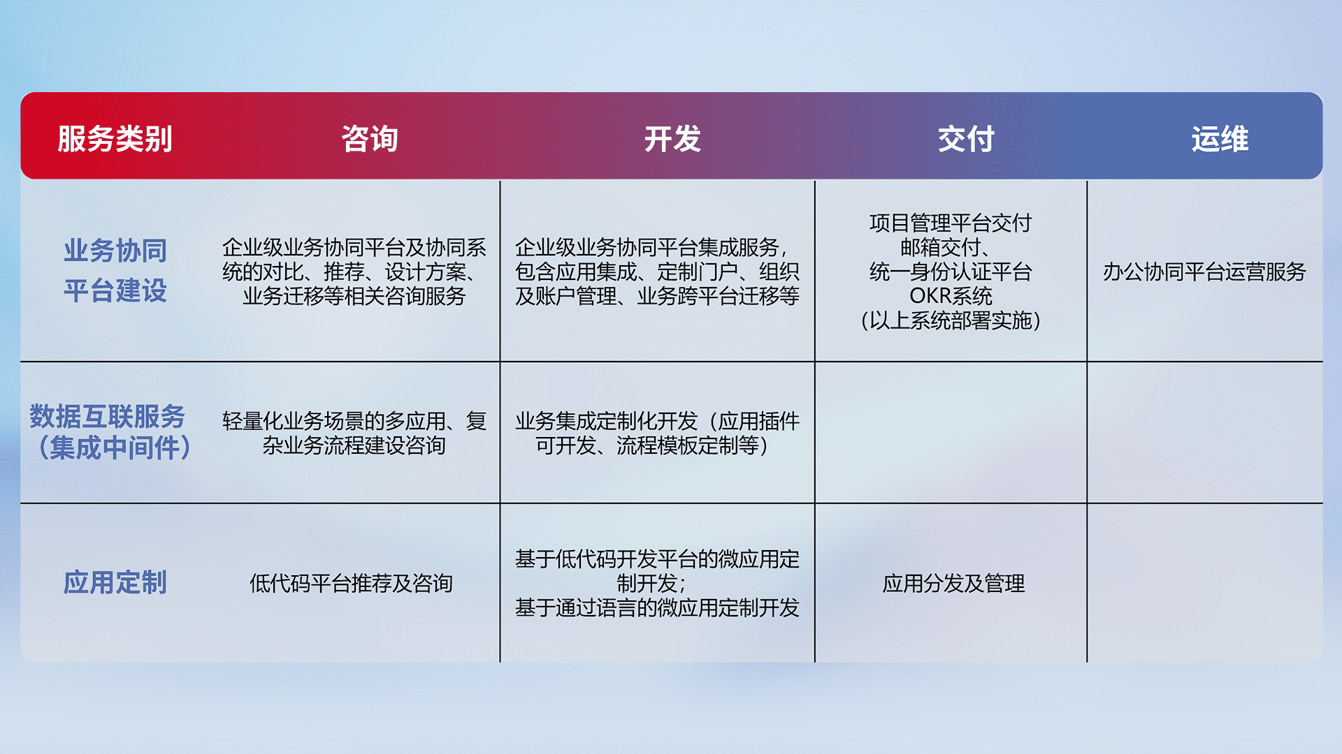 针对钉钉、、、企微、、IDaas等平台级产品提供产品的规划、、、、方案、、交付、、、定制化开发等服务,,实现如统一协同办公、、、、智能客户服务、、混合会议管理、、智能数据查询、、、等业务场景,,实现数字化转型。。。